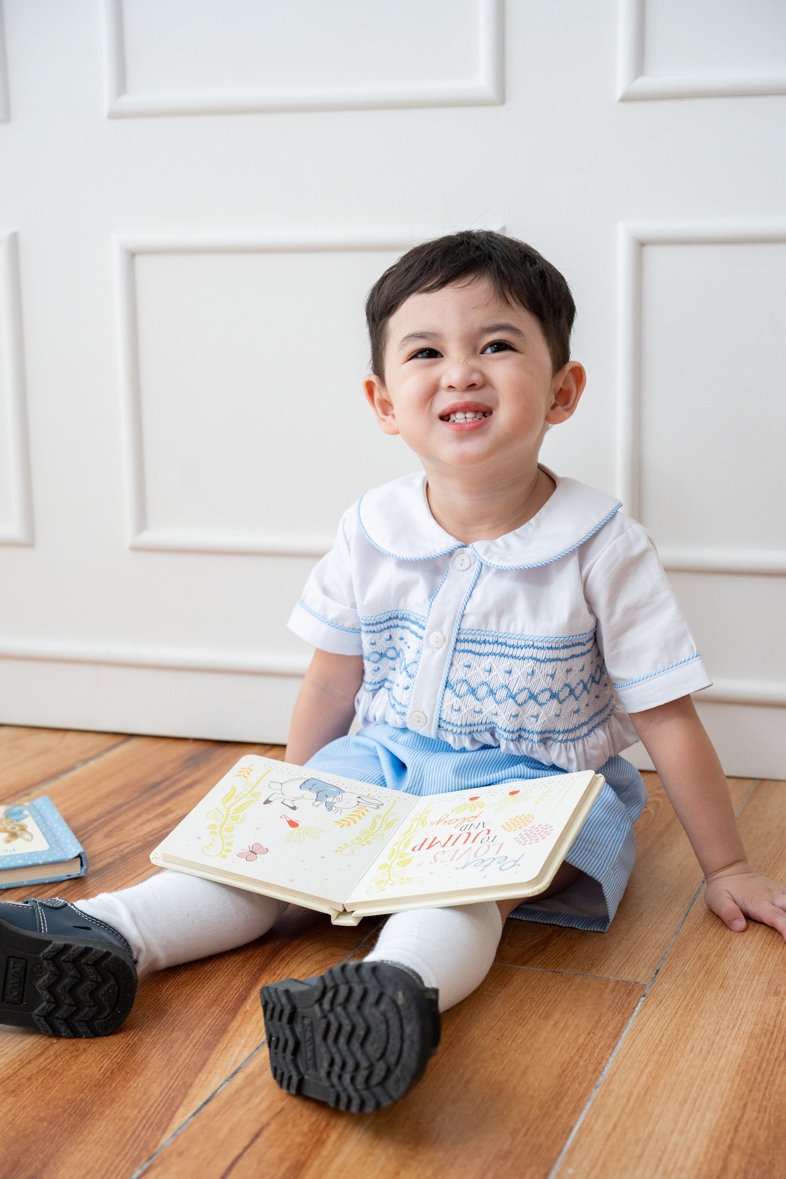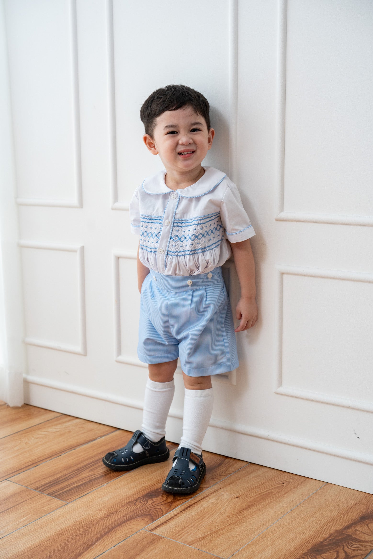 This charming outfit features a Peter Pan collar, hand-smocked top and matching shorts in classic bluebell stripe—perfect for more festive moments or everyday style. This set is designed to be treasured for years to come.
