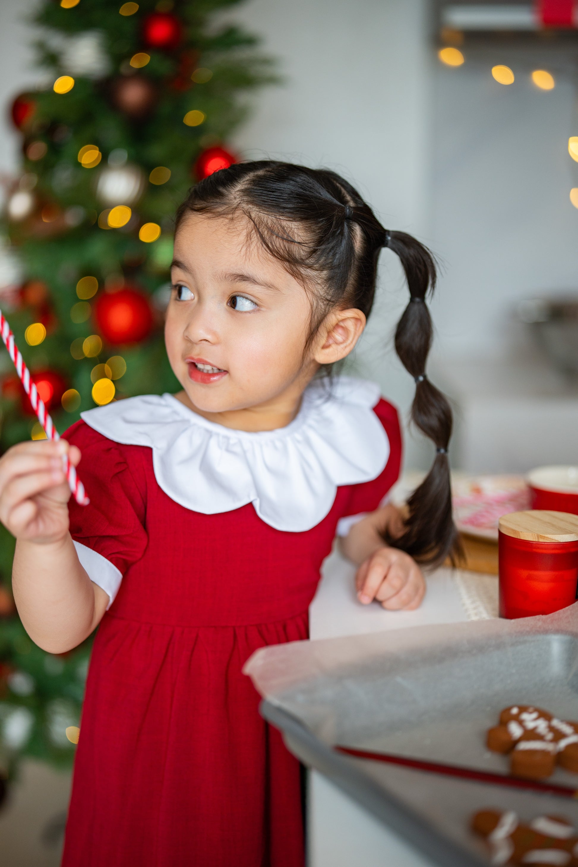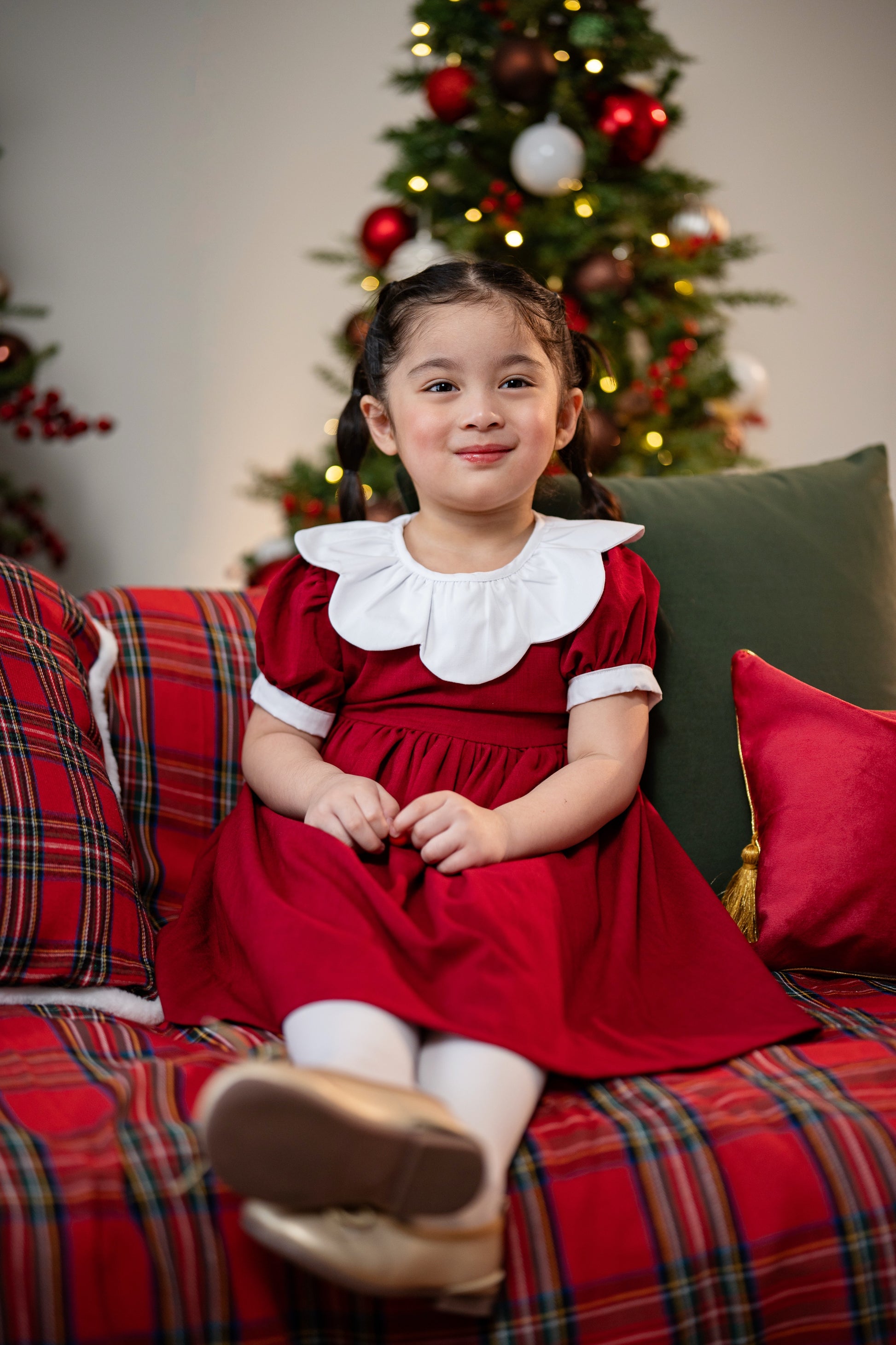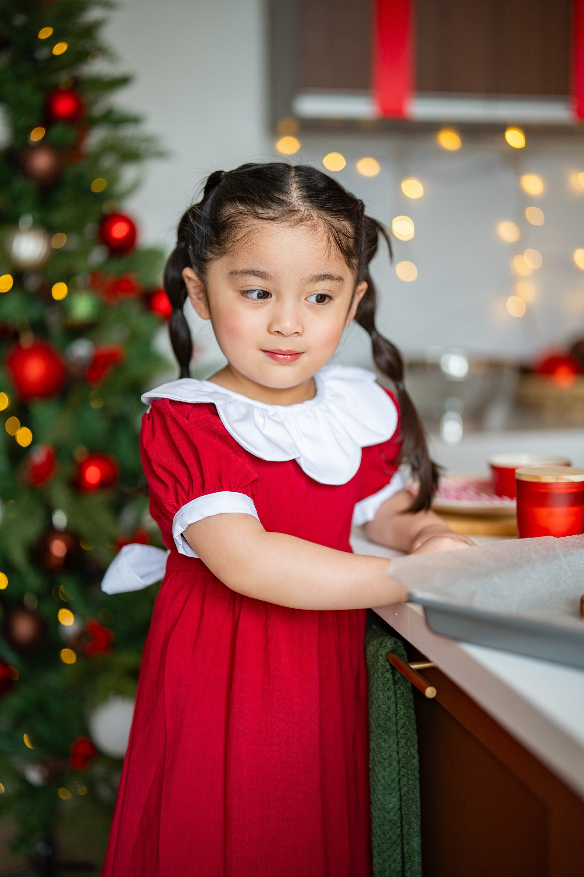 A festive favorite in a rich ruby hue, the Scarlett Dread captures the charm of traditional holiday dressing. Featuring a beautifully gathered silhouette, crisp white scallop collar, and an elegant sash that ties into the sweetest bow at the back. Perfect for treasured family moments and picture-perfect celebrations all season long 🎁