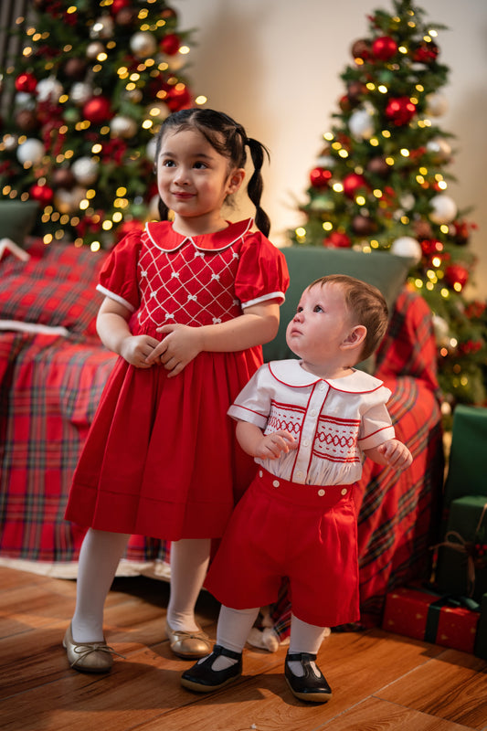 Festive tartans, hand-embroidered roses, delicately hand-smocked bows, scallop collars, and a palette of rich reds and deep rubies. A Christmas collection crafted for the most magical season of all ❤️