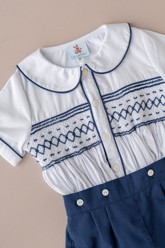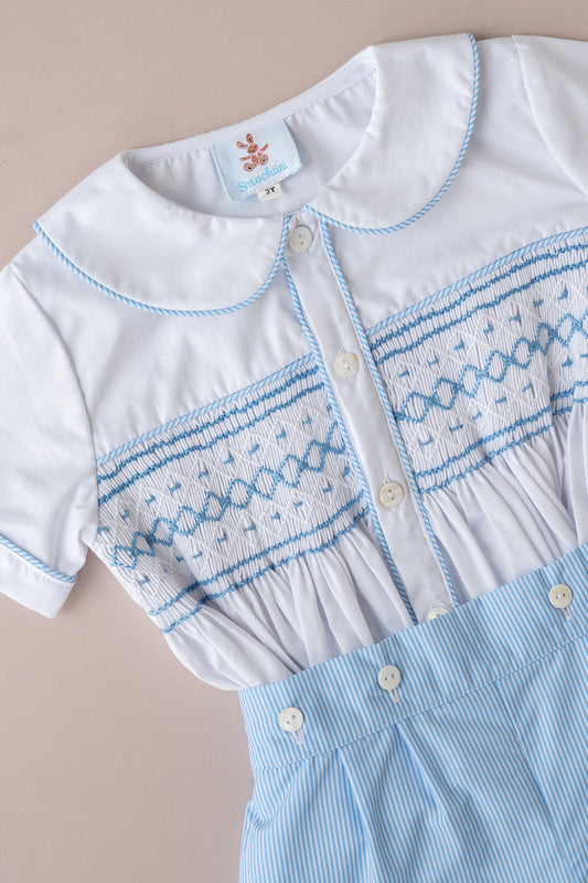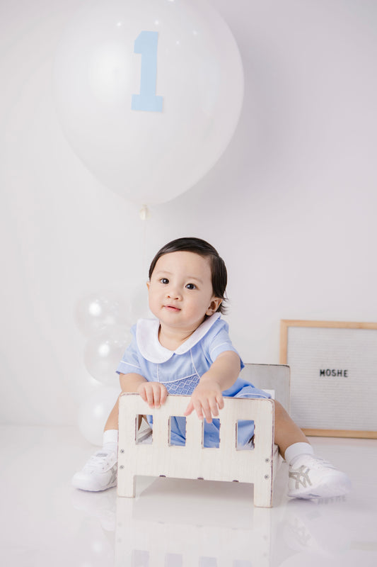 Discover our Christening Classics Collection, a beautifully curated pair of hand-smocked rompers for baby boys. Choose from a pure, all-white design or a charming style finished with delicate blue smocking and trims — both perfect for baptisms and timeless family keepsakes 🕊️